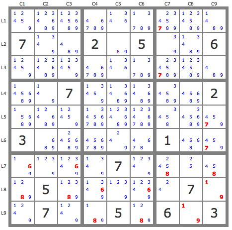 Un premier jeu de pistes issues de la paire 1L2 permet plusieurs éliminations (candidats barrés en rouge), en utilisant la règle de non-consécutivité qui permet de développer les deux pistes et d'éliminer le 3L2C2 et le 4L2C8.