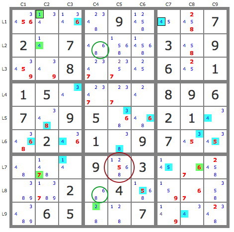 P1 (6L7C8) et P2 (6L8C8). P2 se développe bien et passe par 4L1C7. Q1 (5L1C7) opposée à P2 associée à P1 couvre la grille et on vérifie que P2 est invalide donc unicité et niveau TDP ?