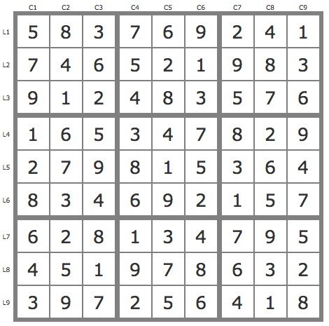 @ Richard : Ce sont les représentations appelées rn et cn par Denis Berthier dans "The Hiden Logic of Sudoku" et accessibles avec le logiciel de Robert. Je les nomme respectivement LN et NC en respectant la notation matricielle usuelle: ligne-colonne. Pour la première, et pour un candidat (l,c,n) L a la valeur l, N la valeur n et la case LN contient c. Comme le logiciel que j'utilise ne fait pas de simplifications systématiques en présence de paires, etc.ces représentations me sont bien utiles.