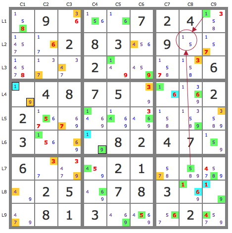 A ce stade, on examine un second jeu de pistes au départ du couple 1/9 de L6C4. La piste verte s'oppose à la piste bleue (le 9 vert et le 1 bleu se voient), ce qui permet de dire que tous les candidats de la piste jaune sont des candidats de la piste verte (voir Technique des pistes). On peut ainsi développer la piste verte qui conduit à une contradiction dans la case L2C8 (pas de candidats verts). C'est donc le 1 de L6C4 qui est solution de cette case.