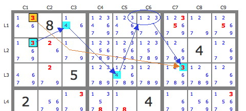 Les deux pistes conduisant au 3 de L3C7, le 3 est solution de cette case.
